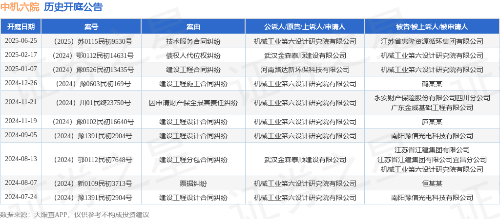 本站消息,根据天眼查APP显示,近日公布了一则机械工业第六设计研究院有限公司作为原告/上诉人的开庭公告,详细内容如下:
